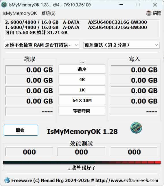 IsMyMemoryOK 是一款轻量级内存诊断工具,专注于帮助用户快速检测和定位计算机内存(RAM)中的潜在问题。它通过执行一系列严格的内存读写测试,有效识别内存模块中的错误或故障,从而确保系统运行稳定与性能可靠。该工具界面简洁、操作直观,测试结果一目了然,既适合普通用户进行日常内存健康检查,也可为专业技术人员提供准确的诊断参考。
