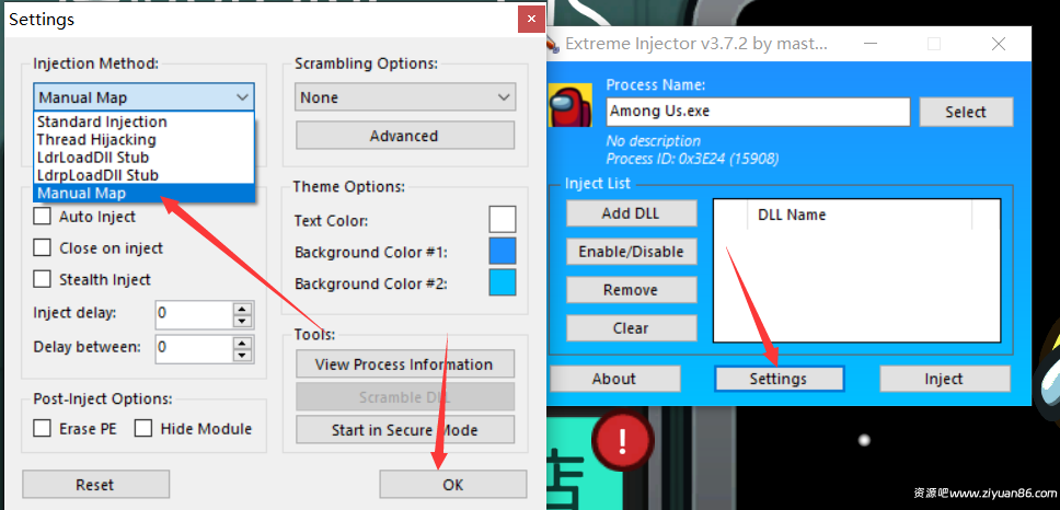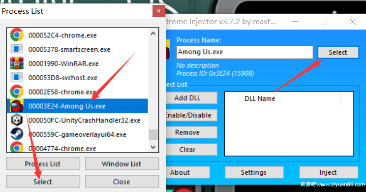 2.以管理员方式打开注入器,选择游戏进程为Among Us.exe,如下图: