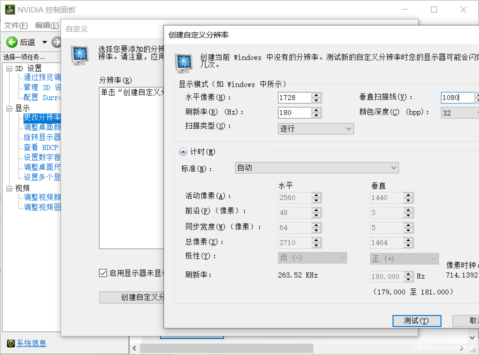如果你电脑没有1728x1080的分辨率,可以去英伟达控制面板设置自定义分辨率,如下图: